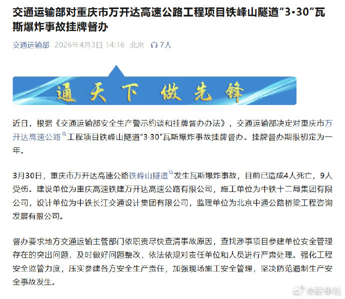 【1】交通运输部对重庆市万开达高速公路工程项目铁峰山隧道“3·30”瓦斯爆炸事故挂牌督办